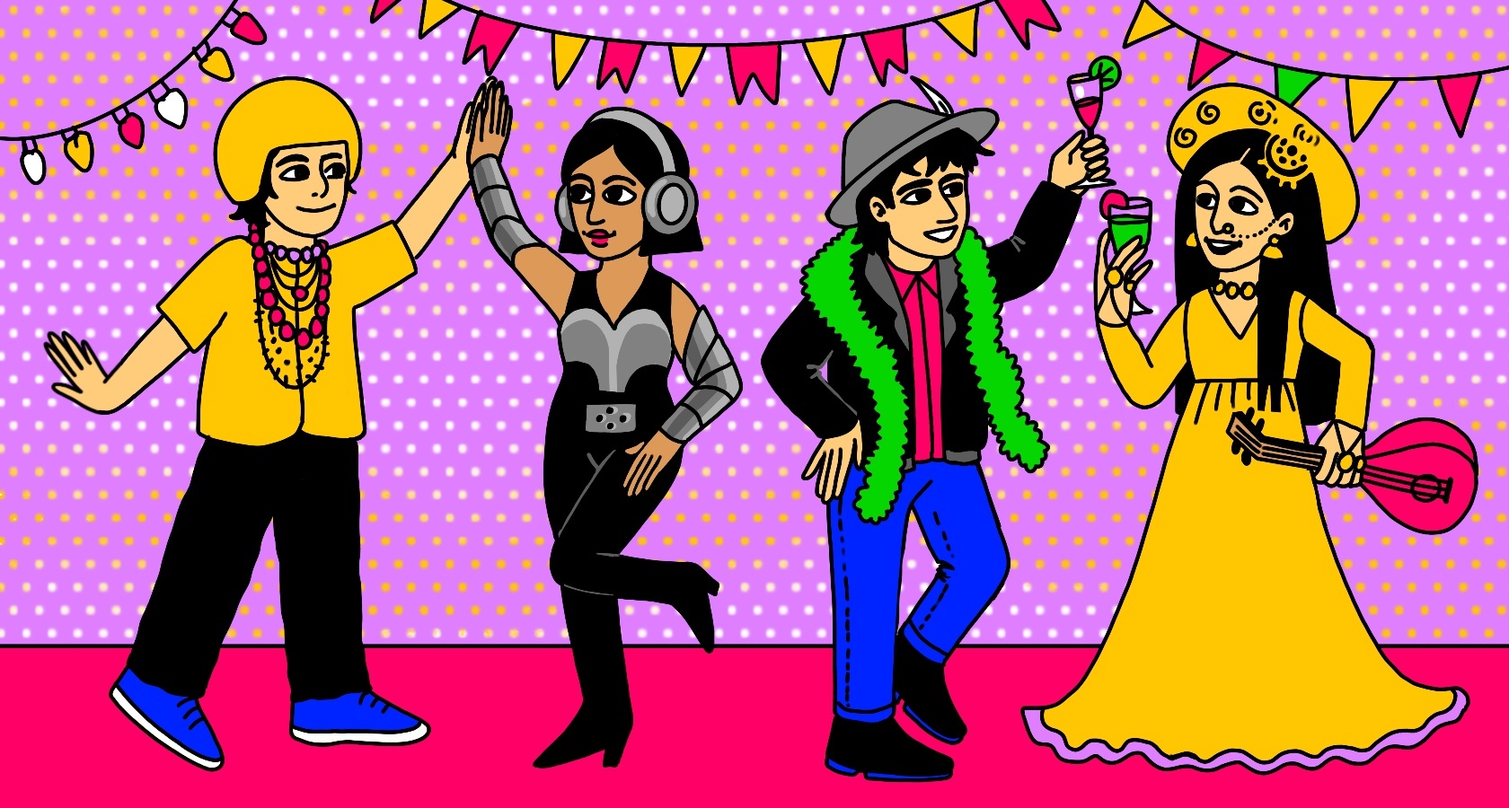 Танцуем, подводим итоги конкурса костюмов и играем в лотерею среди всех участников вечеринки